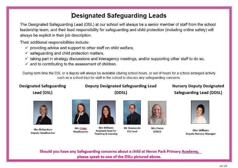 At Heron Park Primary Academy, our pupils’ welfare is our paramount concern. Our whole school approach to safeguarding is based upon an understanding of the local context and an attitude of ‘it could happen here’.